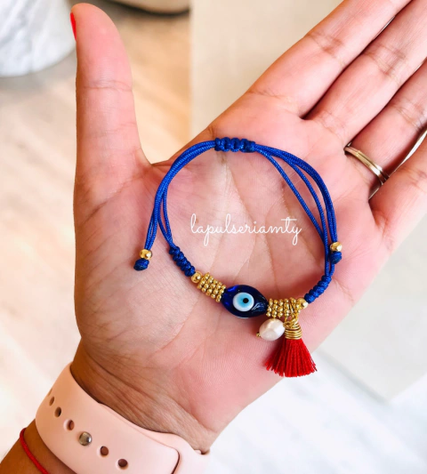 Pulsera ajustable azul marino con ojo turco de murano, perla rio y pompon rojo. material rodio